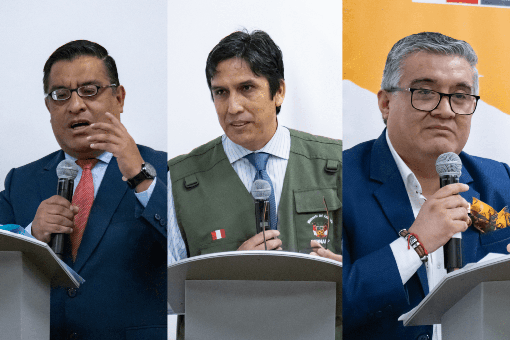 César Nieto, General Manager of EMAPA Cañete; José Carlos Nieto, Head of SERNANP; and Juan Carlos Castro, Minister of the Environment during their speeches.