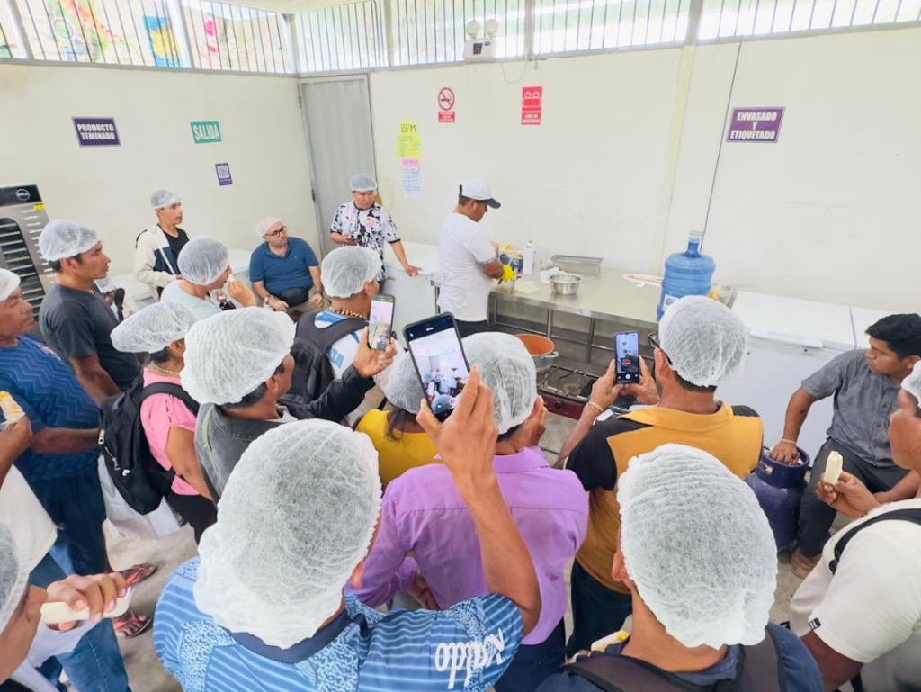 Likewise, technician Segundo Chanchari Mori gave a practical demonstration on sustainable harvesting without felling, using tools for climbing Amazonian palm trees. For his part, ASPROMAG manager Felipe Gutiérrez Usquiza, together with plant operator Tarsis Villanueva Campos, led a practical session on the processing and marketing of aguaje, in which participants made derivative products such as handmade popsicles and soaps.