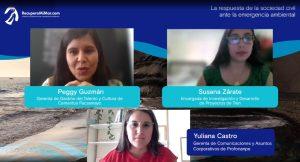 The event was attended by Claudia Godfrey, Director of Innovation and Strategic Management of Profonanpe, and representatives of allied environmental organizations such as Cynthia Céspedes, Manager of the Oceans Program of Conservation International; Miguel Pacheco, Policy Director of WWF Peru; and Daniella Biffi, Researcher of EcOceánica. They reviewed the environmental emergency in Ventanilla, the impact on our ocean and wildlife, and how civil society voluntarily joined #RecuperoMiMar to contribute to the clean-up and mitigation of the damage to the coastal marine ecosystem. In this regard, Claudia Godfrey commented that «The response from civil society was very good, we raised 149 thousand soles between citizens and companies, in addition to the support of international cooperation, so we can assure that we reached and surpassed our goal».
