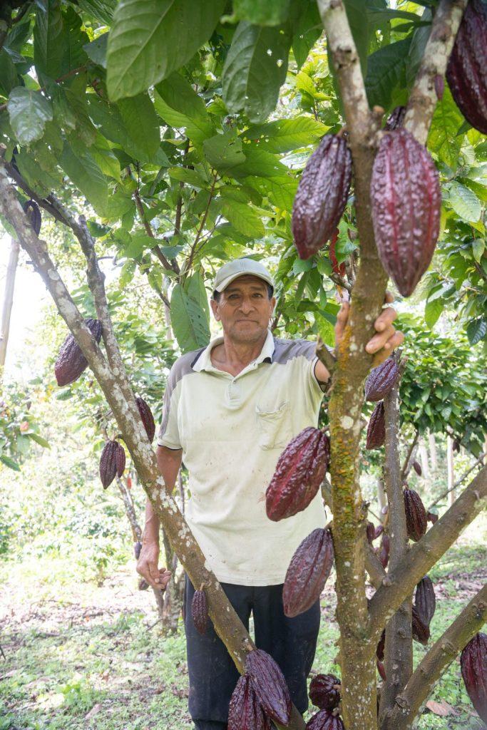 Normel Perez in his cocoa cultivation plot, located in the district of Alonso de Alvarado, San Martín region, on May 15, 2025. (Photo: Profonanpe)